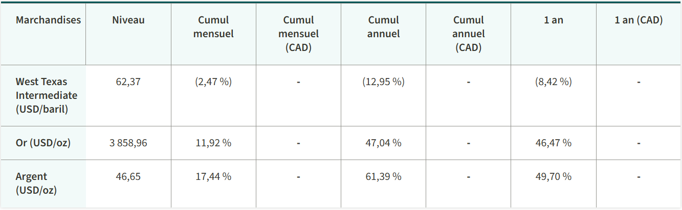 Le prix de l’or n’a cessé d’atteindre de nouveaux records en septembre. Dans une économie mondiale aux prises avec l’incertitude causée par les bouleversements commerciaux, les tensions géopolitiques et de sombres perspectives en matière d’inflation, les investisseurs se sont tournés vers cette valeur refuge. Plusieurs facteurs ont fait monter le prix de l’or en septembre, le premier étant l’incertitude économique persistante. En période d’incertitude, la demande pour l’or augmente et son prix également. Au fil du mois, la perspective que la Fed sabre dans les taux d’intérêt à sa rencontre de septembre s’est intensifiée, même si cette réduction risquait d’ajouter aux pressions inflationnistes. Simultanément, le dollar des États-Unis s’est affaibli à cause des préoccupations suscitées par les tensions commerciales et l’économie des États-Unis. Le prix de l’or s’est envolé lorsque certains rapports ont laissé entendre que la Chine aspirait à devenir dépositaire des réserves d’or souveraines étrangères. L’industrie de l’extraction d’or du Canada, un acteur majeur sur le marché mondial, a tiré profit de la flambée du prix de l’or. Et cela s’est réfléchi sur le cours des entreprises du secteur des matériaux, qui s’est hissé de 19 % en septembre et de 78 % d’une année sur l’autre. Le prix de l’or a gagné 12 % en septembre, pour atteindre plus de 3 800 $ US pour la toute première fois.